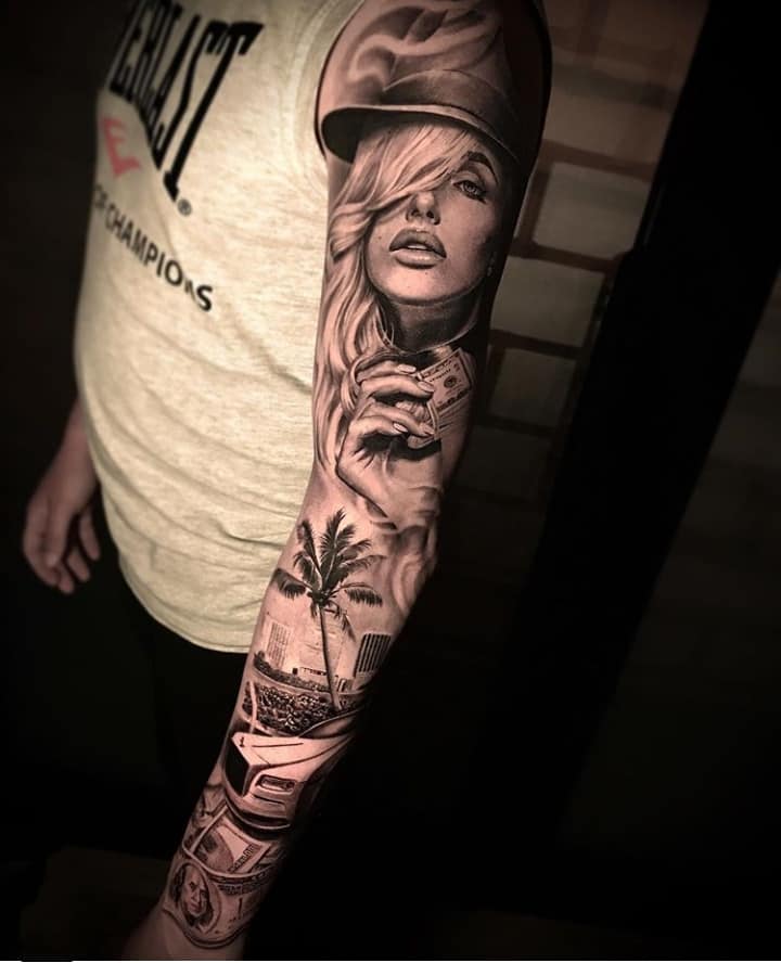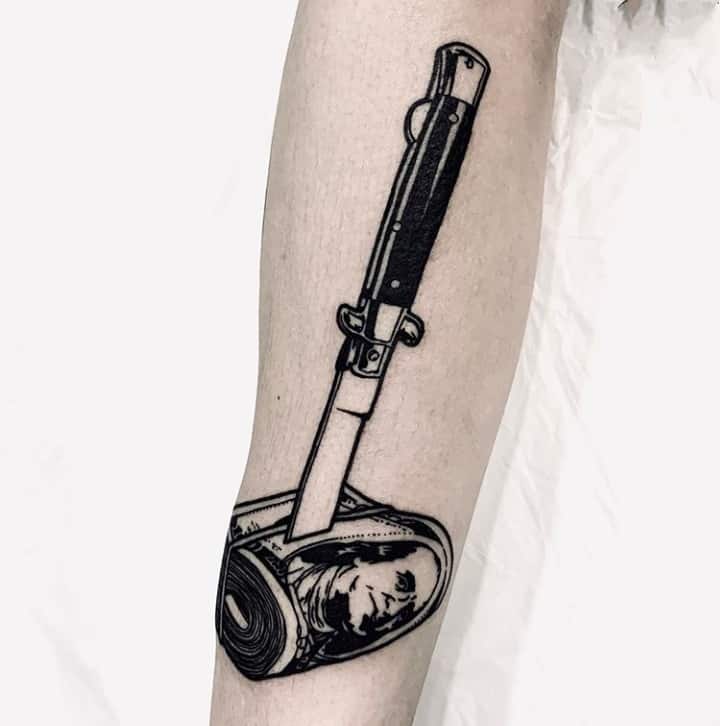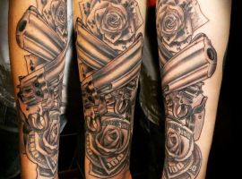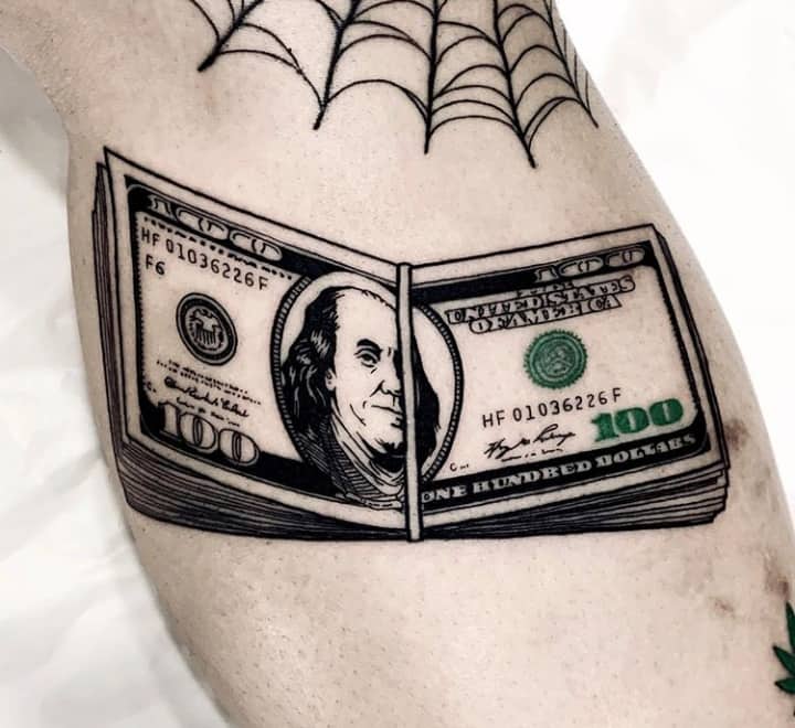Зображення купюр в комбінації з картами і зброєю стане магнітом для залучення успіхів у всіх життєвих сферах. Татуювання стає каталізатором для внутрішньої енергетики людини, завдяки чому будуть приходити несподівані приємні новини. Однак це не означає, що після нанесення зображення господар малюнка може сісти, і нічого не робити. Тату стане допоміжним двигуном, що примножує вже наявні успіхи.