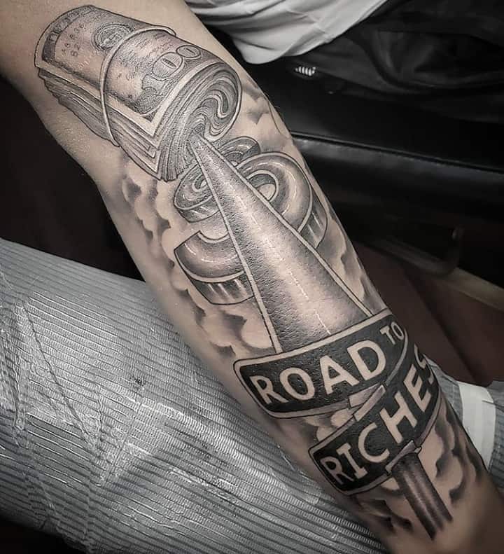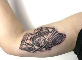 Татуювання з банкнотами є уособлення шику і багатого життя. Їх господарі постійно прагнуть до кращого рівня життя, цінують матеріальний комфорт, люблять добре їсти і одягатися. Також такі люди багато працюють, все, чим можна пишатися, вони досягли своєю працею. Тату із зображенням грошей тільки недавно почали користуватися популярністю. Це сталося з приходом в моду езотеричних тенденцій і зацікавленості в духовних практиках.