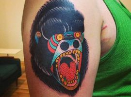 Також всім нам відомий Кінг-Конг як горила величезних розмірів, що прийшла до нас з кінематографа. Вперше кіно про нього вийшло в 1933 році, і з тих пір він зустрічався у безлічі фільмів, мультфільмів, ігор, серіалів, коміксів і тд.. І звичайно ж, любителі тату-культури часто вибирають його в якості ідеї для натільних малюнків.