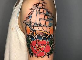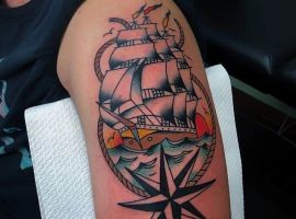Татуювання корабля буде стильно виглядати як в чорно-білому виконанні, так і в кольоровому. Спочатку тату в подібній тематиці з’явилися саме в техніці олдскл. І зараз малюнки в цій манері виконання вважаються найпопулярнішими. Це не яскраве зображення в стриманій гамі і з чіткими контурами. Досить часто доповнюють його штурвалами, які символізують управління власним життям, якорями, які означають безпеку, сталість.
