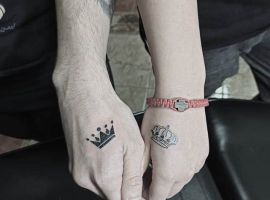 Відмінний варіант для закоханої пари – це парна татуювання з коронами. За допомогою такого ескізу підкреслюється винятковість відносин, то, що ця пара зовсім не така, як інші.