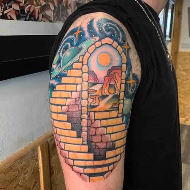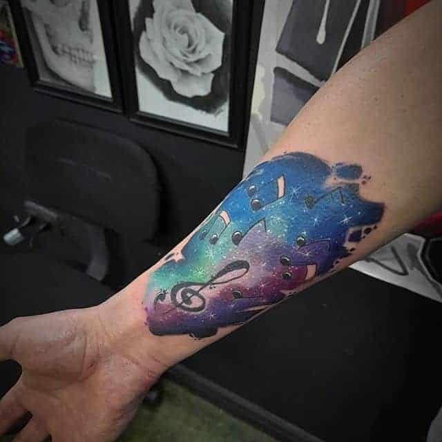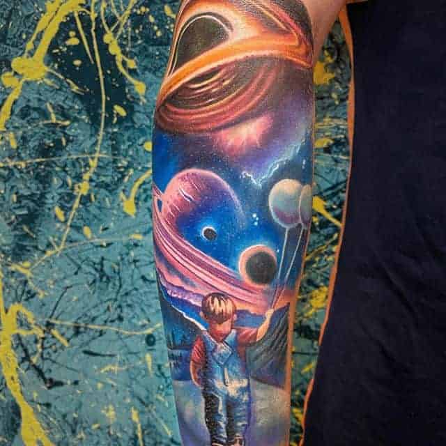 Кольорові татуювання на космічну тему можна робити в будь-яких стилях. У реалізмі можна зробити рукав або тату на спині.