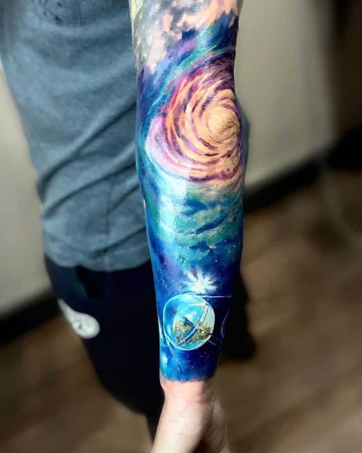 Планети тату можуть бути виконані в будь-якому стилі. Ефектно і незвично виглядає тату галактика на руці у вигляді рукава. Ескіз можна зробити цікавіше, якщо додати зображення футуристичних космічних кораблів, що літають в космосі.
