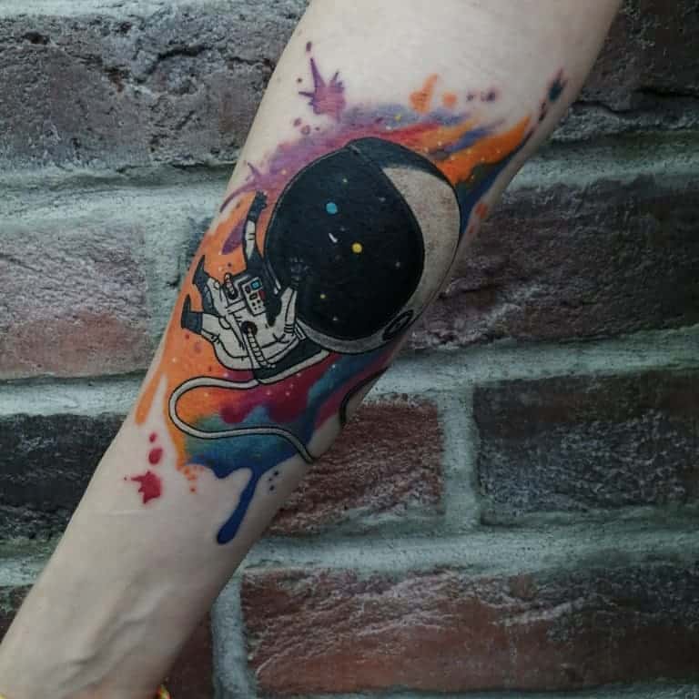 Кольорові татуювання на космічну тему можна робити в будь-яких стилях. Незвично виглядають в стилістиці треш-полька. Їх головна особливість полягає у використанні обмеженої колірної гами (чорний, відтінки сірого і червоного) і поєднанні реалістичного стилю з написами і символами. У такому стилі можна зробити рукав або тату на спині.