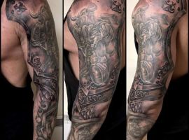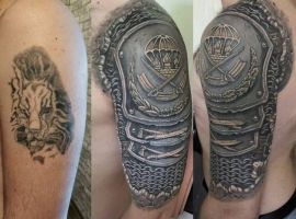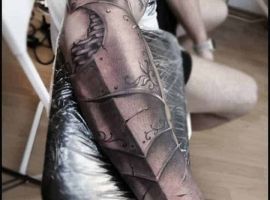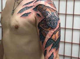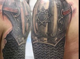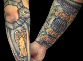 - Обладунки тату у вигляді суцільного рукава або окремого фрагмента в області плеча буде говорити про людину, яка хоче відлякати від себе брехливих людей. Також передпліччя ідеально для людей, не готових приймати в своє життя ворогів. Тату на руці у чоловіка кольчуга значення має внутрішньої душевної сили, непохитності і енергії сексуальності;