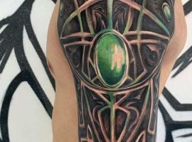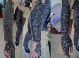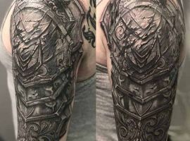 Обладунки тату у вигляді суцільного рукава або окремого фрагмента в області плеча буде говорити про людину, яка хоче відлякати від себе брехливих людей. - Кольчуга тату на передпліччі. Варіант ідеальний для “бунтарів в краватках”, тату лати гладіатора легко приховати під сорочкою, що зручно при наявності робочого дрес-коду.