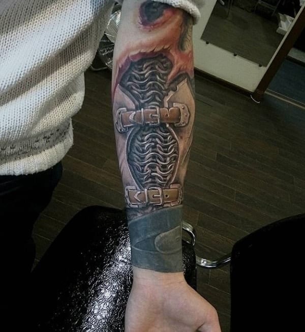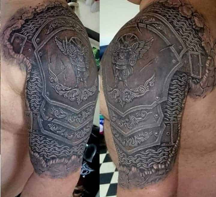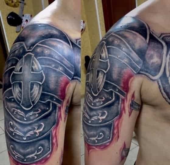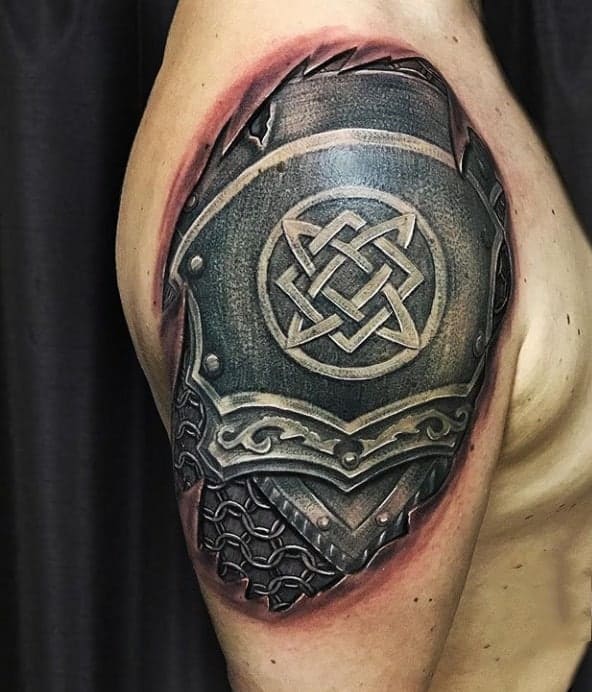 Обладунки тату у вигляді суцільного рукава або окремого фрагмента в області плеча буде говорити про людину, яка хоче відлякати від себе брехливих людей. - Кольчуга тату на передпліччі. Варіант ідеальний для “бунтарів в краватках”, тату лати гладіатора легко приховати під сорочкою, що зручно при наявності робочого дрес-коду.