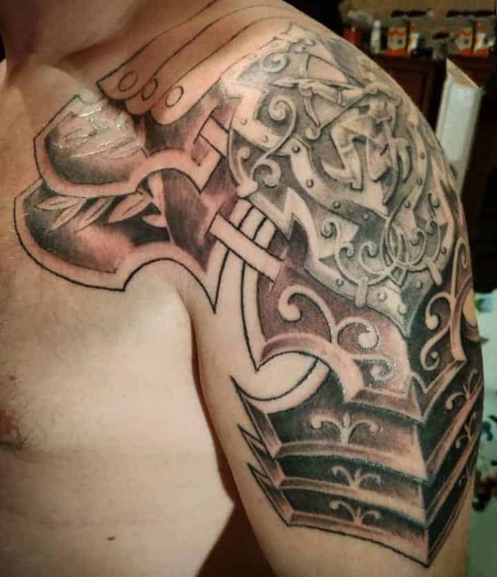 - Тату кольчуга на плечі значення несе захисту, буде оберігати свого власника від будь-якого зла і недоброзичливців. А також навчить вміти постояти за себе.