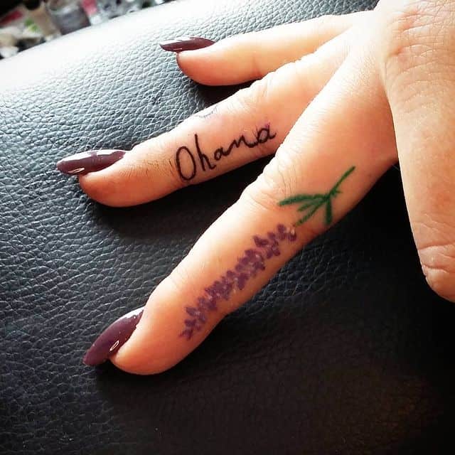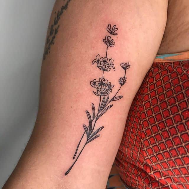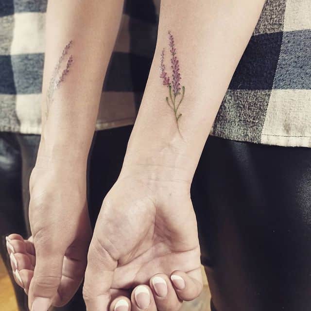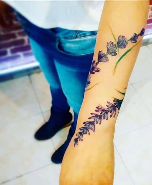 Найпопулярнішим ескізом є тонка гілочка, всипана маленьким зеленим листям і фіолетовими квіточками. У такому малюнку переважають подовжені лінії. Виходячи з цього, таке тату найкраще виглядає на руці, нозі, лопатці, боці.