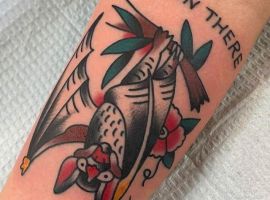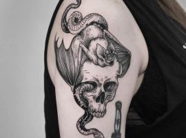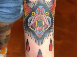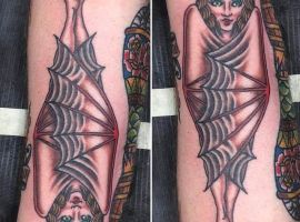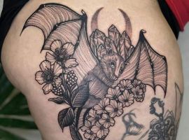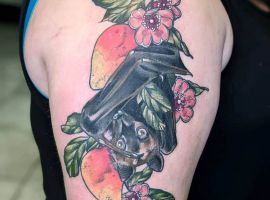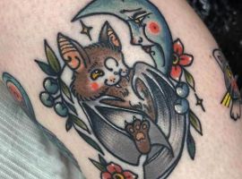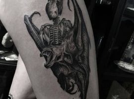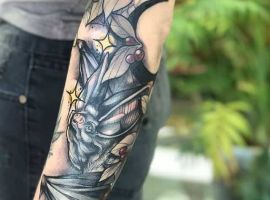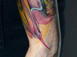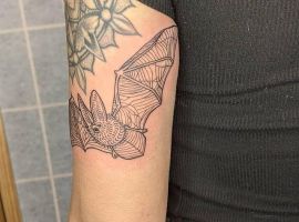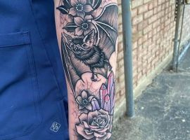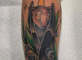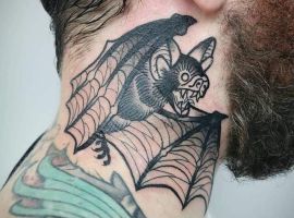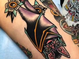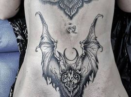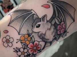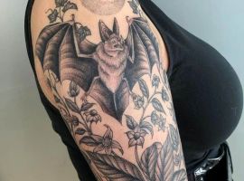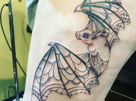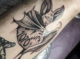 Татуювання кажан на тілі – це багатозначний символ. Таке зображення може говорити як про агресивність, так і про таємничость. А, можливо, що це і знак чоловіка, який служив у розвідці. Найчастіше цей літаючий ссавець зображують на темному тлі близько місяця. Але можуть бути і інші, більш неординарні варіанти. У будь-якому випадку майстри тату салону Альянс виконають для вас ідеальний ескіз, а потім і саму татуювання.