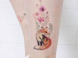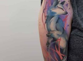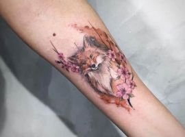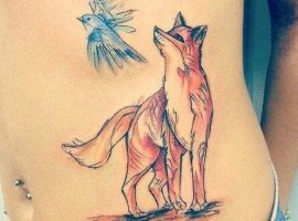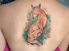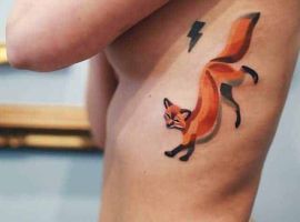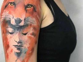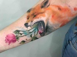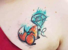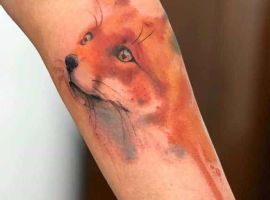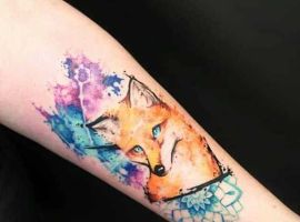 Композиція, геометрія і стилістичні деталі істотно зображаються в тату лисиці нанесеній аквареллю. Ескіз татуювання лисиця несе в собі сакральний і філософський сенс. Основою татуювання в стилі акварель є: