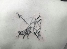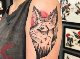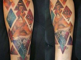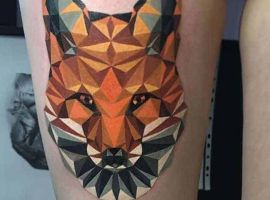 - Геометрія в стилі татуювання лисиця мінімалізм, широко використовується на великих ділянках тіла наприклад: плече, бік, гомілка. Завдяки геометрично досконалим фігурам зображення лисиці стає ще більш барвистим.