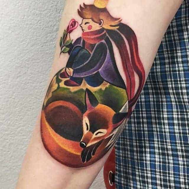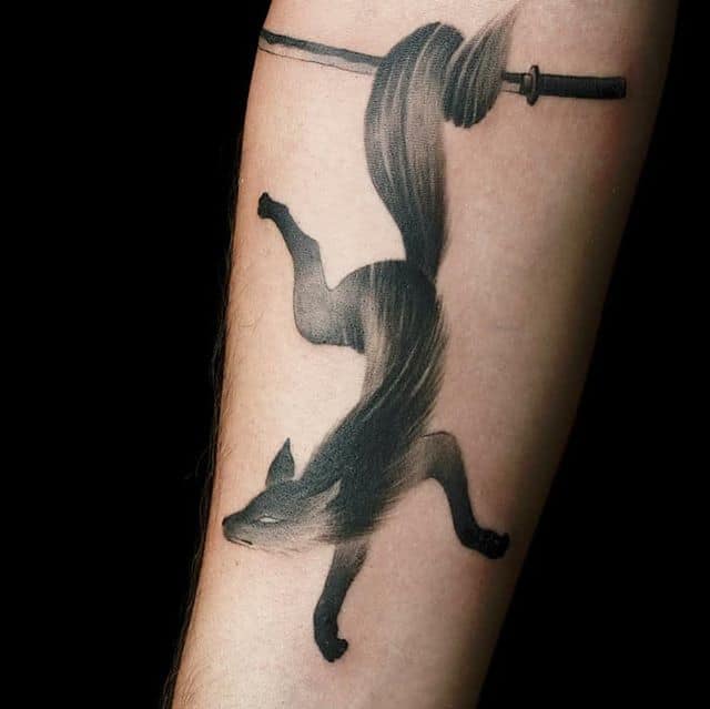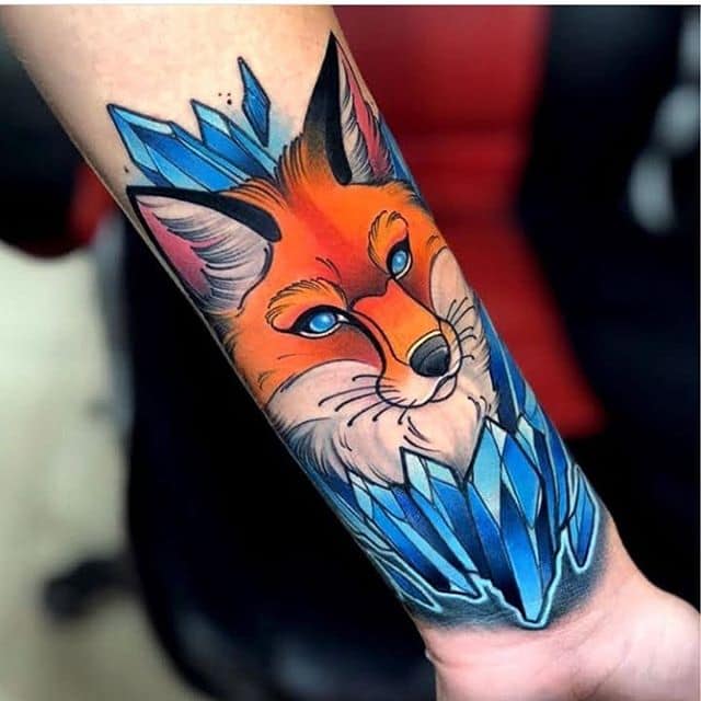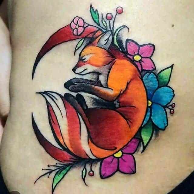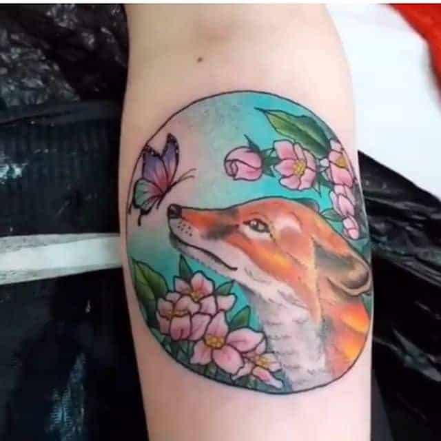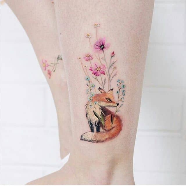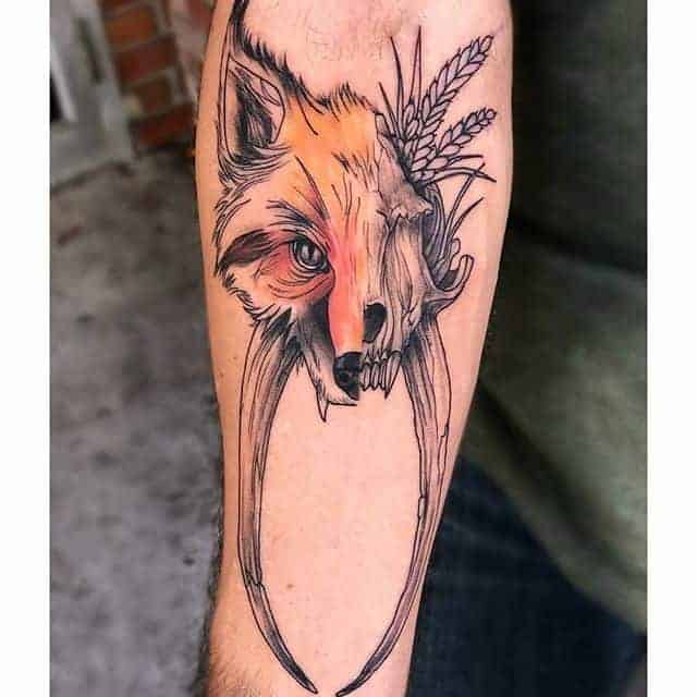Колірна гамма і стилістика тату з образом лисиці може варіюватися в забарвлені: чорного, червоного або з використанням акварелі в кольоровому нанесенні. У колористику останнього методу додаються помаранчевий або вогненно-червоний колір тварини. Стилістика із зображенням цієї хитро мудрої тварини виділяється серед: