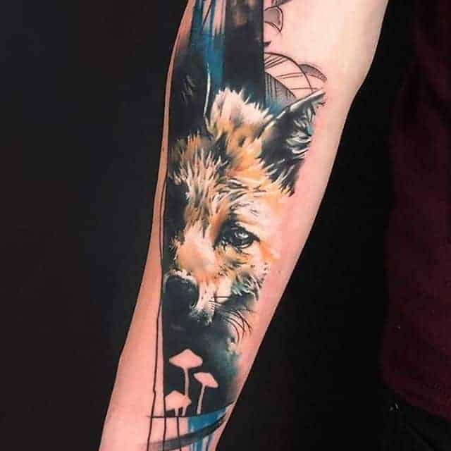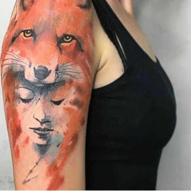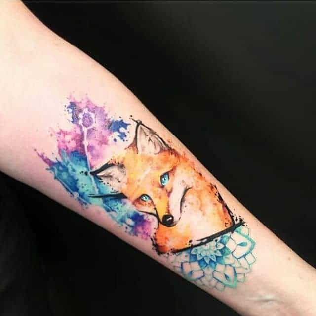 Композиція, геометрія і стилістичні деталі істотно зображаються в тату лисиці нанесеній аквареллю. Ескіз татуювання лисиця несе в собі сакральний і філософський сенс. Основою татуювання в стилі акварель є: