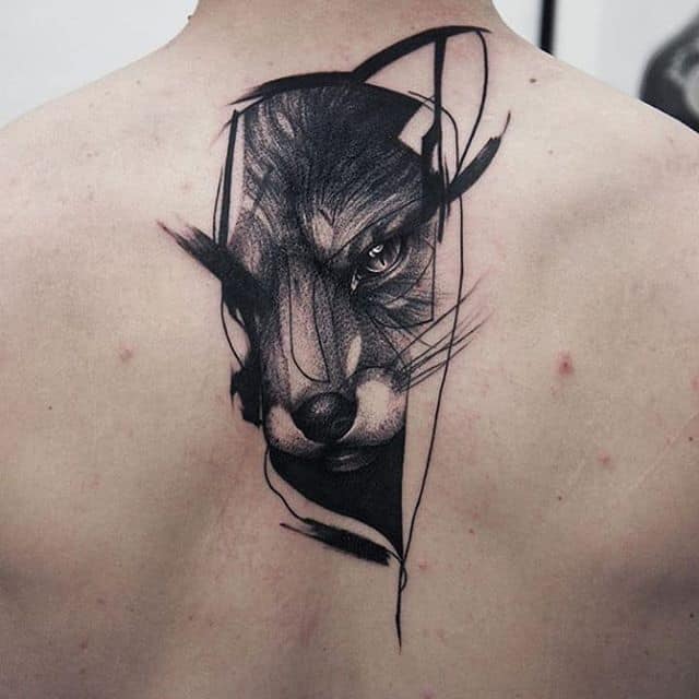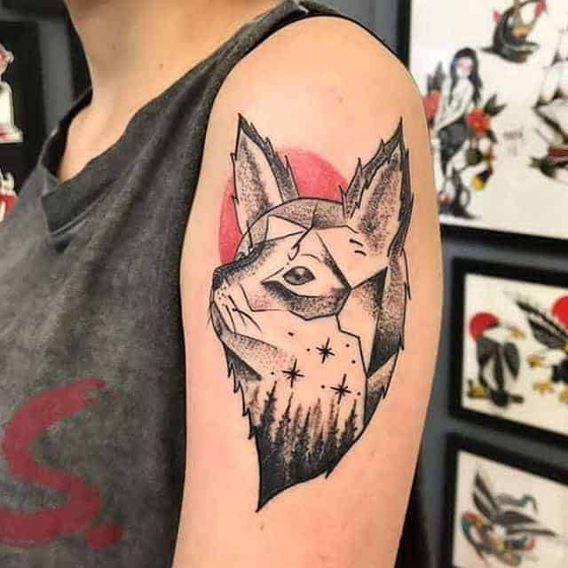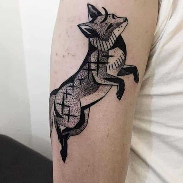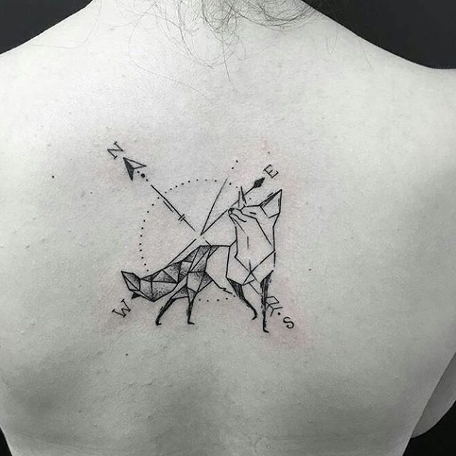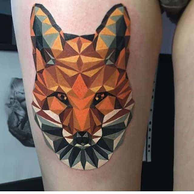 - Геометрія в стилі татуювання лисиця мінімалізм, широко використовується на великих ділянках тіла наприклад: плече, бік, гомілка. Завдяки геометрично досконалим фігурам зображення лисиці стає ще більш барвистим.