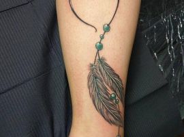 У тату ескіз часто ще додають пір’я, як прикрасу. Вони символізують повітря, дихання, саме життя, залучають позитивні думки, події, міцний і спокійний сон. Також багато хто вірить, що таке зображення може допомогти відновити життєву енергію і силу, вибрати правильний життєвий шлях і призначення людини. Крім того, ловець снів татуювання позначає любов до саморозвитку, самопізнання, багатий духовний досвід.