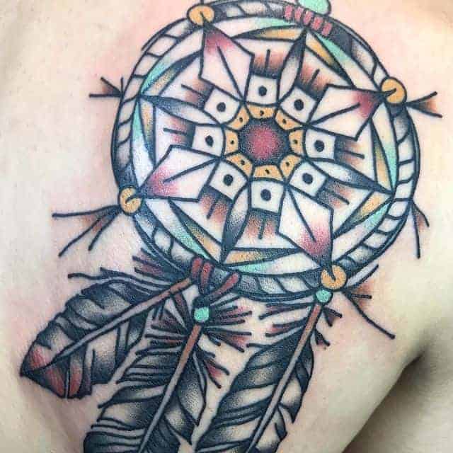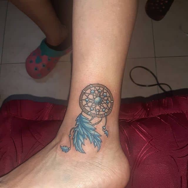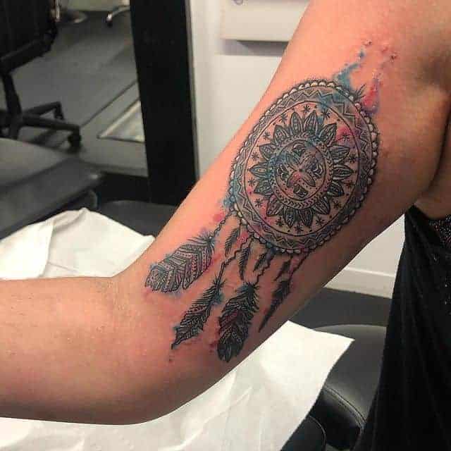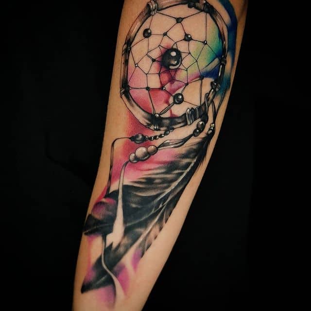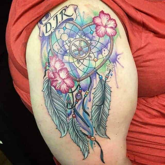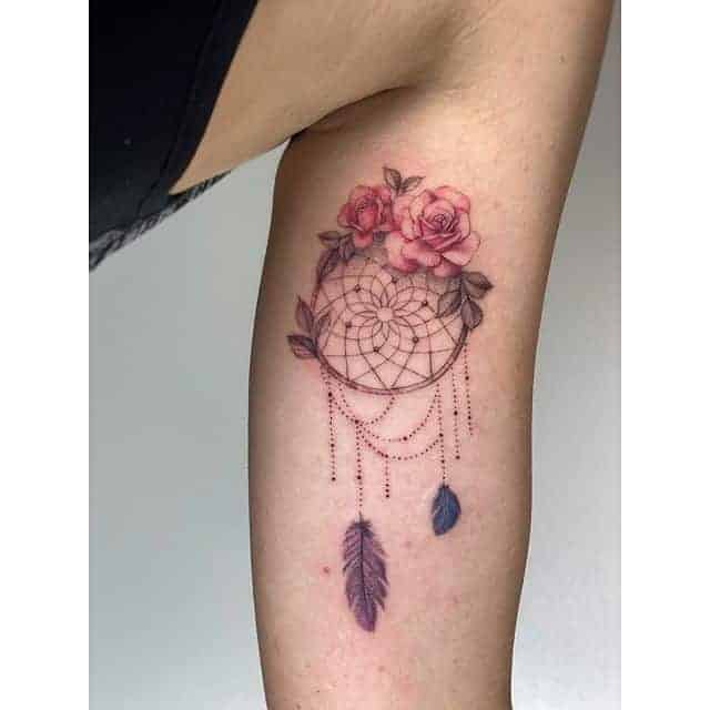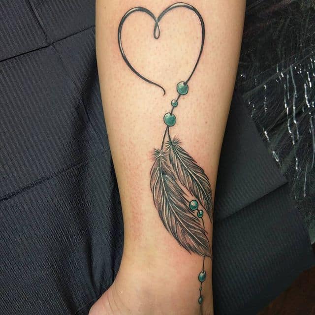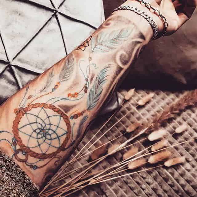 У тату ескіз часто ще додають пір’я, як прикрасу. Вони символізують повітря, дихання, саме життя, залучають позитивні думки, події, міцний і спокійний сон. Також багато хто вірить, що таке зображення може допомогти відновити життєву енергію і силу, вибрати правильний життєвий шлях і призначення людини. Крім того, ловець снів татуювання позначає любов до саморозвитку, самопізнання, багатий духовний досвід.