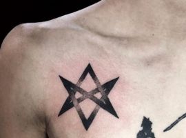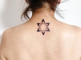 Шестикутна гексаграмма – символ гармонії двох світів: матеріального – це включений в фігуру трикутник з вершиною вгорі, і духовного – це спрямований вниз трикутник. З філософської точки зору тату означає єднання чоловічого і жіночого начал, з релігійної – піднесення Бога над всім сущим.