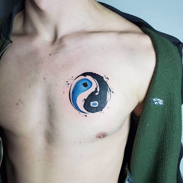 Інь-Ян – буддійський символ нескінченної боротьби протилежностей, що створює гармонію і рівновагу. Талісман, що допомагає знайти себе, досягти спокою й умиротворення. Чорна крапля – жіноче начало, Місяць, пасив, земля. Біла крапля – чоловіче начало, Сонце, актив, світло. Тату підкреслює вміння радіти життю незалежно від обставин.