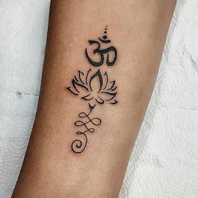 Знак «Ом» – мантра створення всього сущого. Тату несе енергію Всесвіту, гармонізує внутрішній стан людини, стає талісманом, що захищає від бід, що направляють до духовного і особистісного розвитку.