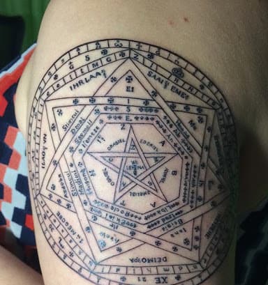 Магічний пентакль Соломона – древній оберіг і талісман. Допомагає залучити надприродні сили, темні або світлі, для досягнення бажаного в обраній сфері. Тату захищає від недоброзичливців, дає енергію, направляє по вірному шляху, дарує удачу в будь-яких починаннях.