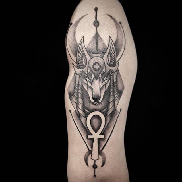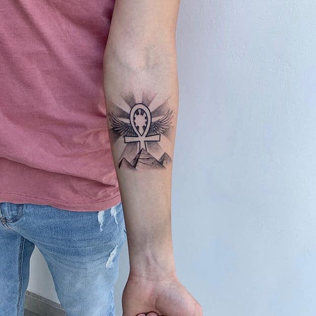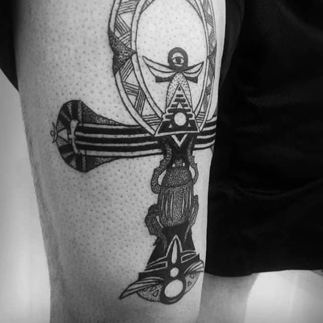 Анкх – давньоєгипетський знак вічності буття. Складається з хреста, що символізує життя, і петлі, яка уособлювала безсмертя і циклічність всього сущого. Тату означає добробут, щастя, мудрість, внутрішню силу.