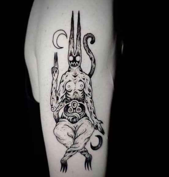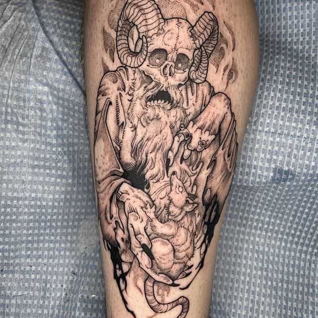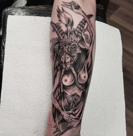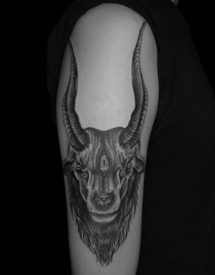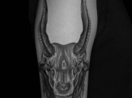 Бафомет – енергійно сильний символ сатанізму, образ Диявола. Тату для тих, хто дотримується сатанинського світогляду, не підкоряється правилам моралі, оспівує егоїзм, незалежність, задоволення власних бажань, непідконтрольність суспільству.