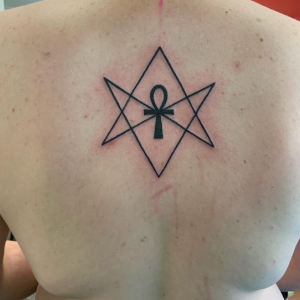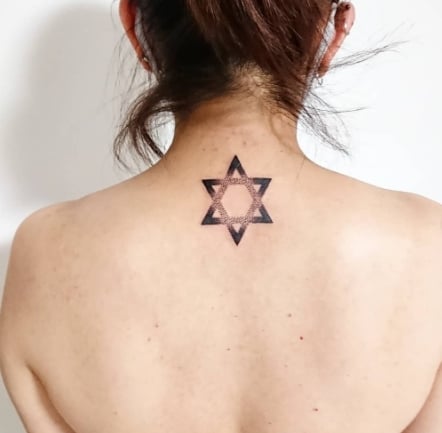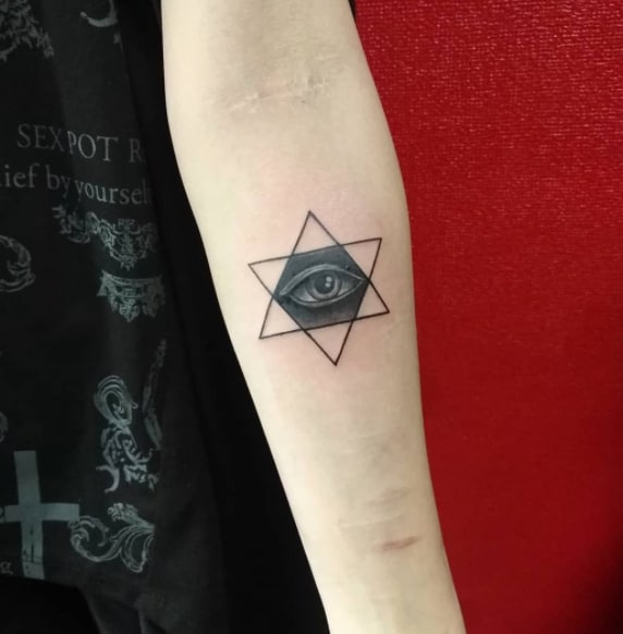 Шестикутна гексаграмма – символ гармонії двох світів: матеріального – це включений в фігуру трикутник з вершиною вгорі, і духовного – це спрямований вниз трикутник. З філософської точки зору тату означає єднання чоловічого і жіночого начал, з релігійної – піднесення Бога над всім сущим.