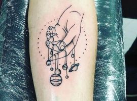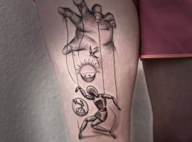 Дуже цікава і нетривіальна ідея для татуювання у вигляді маріонетки. Здавна проводилася паралель між керованою лялькою і людиною, яка підвладна долі. Так що смислове значення татуювання маріонетка полягає в підкресленні того, що людиною постійно управляє якась вища сила. Вона визначає і зовнішні обставини, і поведінку самої людини. Зробивши таке татуювання, людина може висловлювати свій фаталістичний світогляд. Або ж, навпаки, він хоче проявити свою особисту волю. Підкреслити, що він сам керує своїм життям. Таку ідею краще втілити у вигляді маріонетки, яка обірвала нитки і звільнилася.
