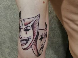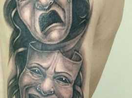 Театральні маски можуть бути абсолютно різними за своїм виглядом. Часто вибирають одночасно дві: трагічну і комічну. Перша означає сльози, печаль, друга – це символ сміху і радості. Татуювання такого типу говорить про подвійність, мінливость натури. Зображення говорить про те, що людина бачиться не таким який вона є насправді. Є й і інший цікавий варіант – це страшні театральні маски. Вони схожі на ті, що є у маніяків з фільмів жахів. Такі зображення говорять перш за все про бажання людини наводити страх і боязнь на оточуючих.