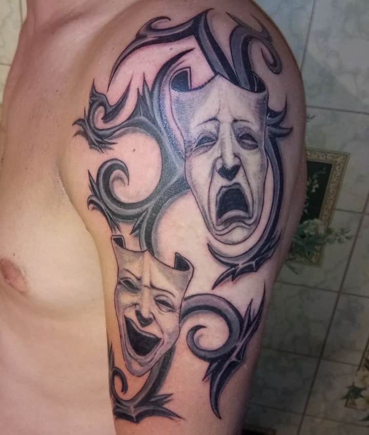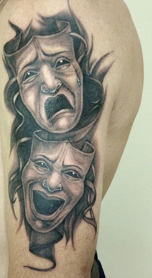 Театральні маски можуть бути абсолютно різними за своїм виглядом. Часто вибирають одночасно дві: трагічну і комічну. Перша означає сльози, печаль, друга – це символ сміху і радості. Татуювання такого типу говорить про подвійність, мінливость натури. Зображення говорить про те, що людина бачиться не таким який вона є насправді. Є й і інший цікавий варіант – це страшні театральні маски. Вони схожі на ті, що є у маніяків з фільмів жахів. Такі зображення говорять перш за все про бажання людини наводити страх і боязнь на оточуючих.