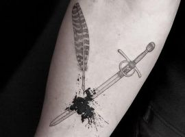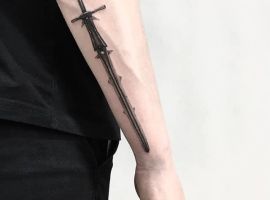 Меч тату завжди асоціюється з силою, мужністю, честю. Справа в тому, що саме ця зброя здавна використовувалося для захисту і нападу на ворога. Також татуювання з мечем можна вважати знаком правосуддя.