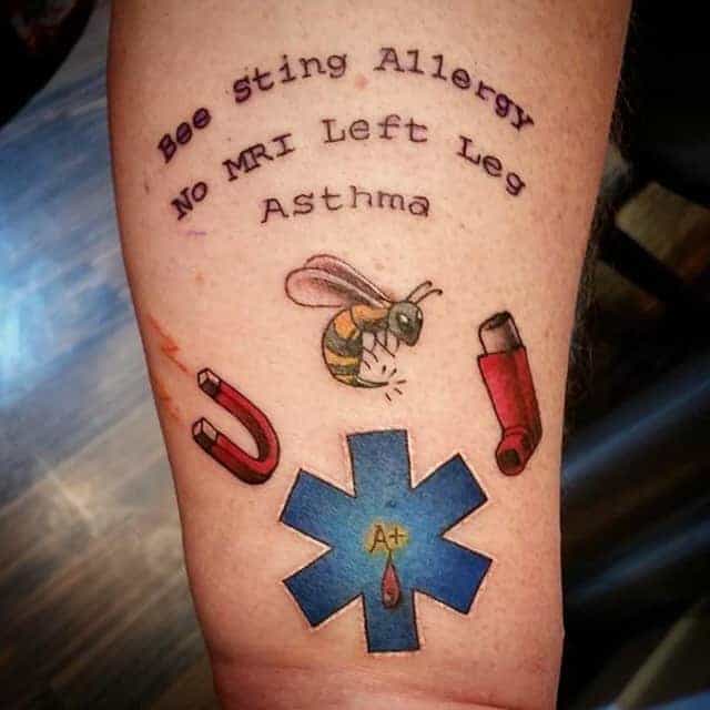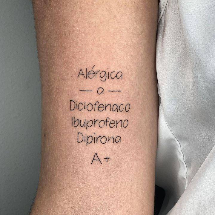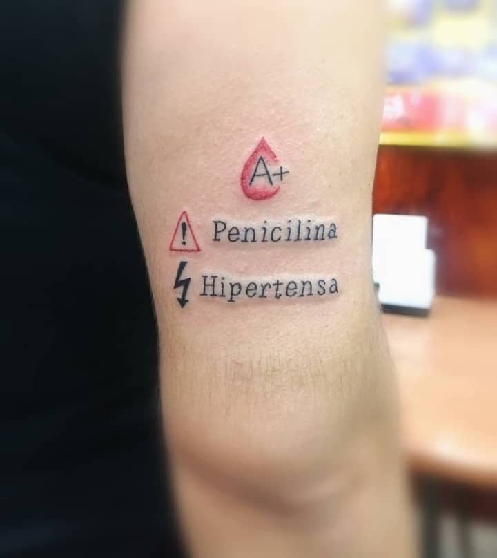 Другий випадок – це алергія на певні препарати і ліки, а також інформація про групу крові. Найчастіше медичні тату роблять на зап’ясті, де якраз і вказують назви того, що може викликати алергійну реакцію. Не маючи такої інформації, лікар може дати людині ліки, яке навпаки може тільки нашкодити здоров’ю хворого і викликати небажані наслідки.