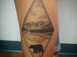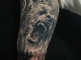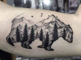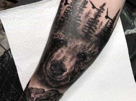 Ескіз, в якому звір знаходиться в своєму природному середовищі – ведмідь у лісі, горах, на природі – не несуть за собою особливо глибокого сенсу. Такі зображення можуть набивати просто для краси та естетики тіла. Найбільш ефектно виглядатиме кольоровий малюнок в стилі реалізм.