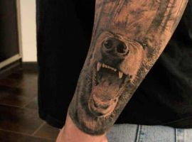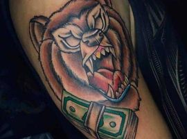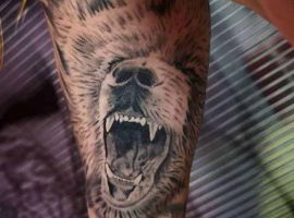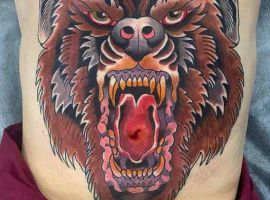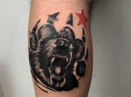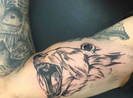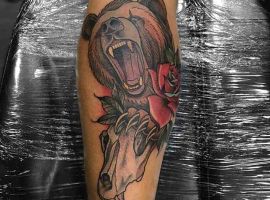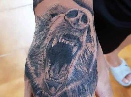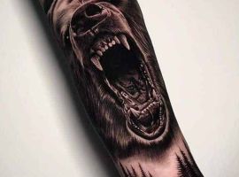 Ревучий звір (татуювання ведмедя з оскалом) означатиме агресію і прагнення захистити себе. Швидше за все, володар малюнка хотів показати, що він веде запеклу боротьбу з кимось або чимось у своєму житті.
