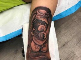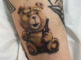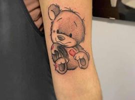 Плюшевий ведмедик. Це скоріше жіночий варіант ескізу. Символізує ніжність, романтичність натури, доброту. Але зустрічаються і варіанти з більш негативним підтекстом – на чоловічому тілі можна зустріти плюшевого ведмедика з фільмів жаху.