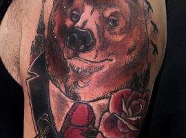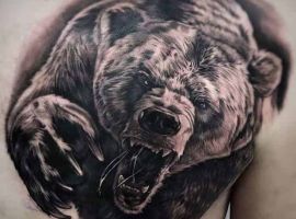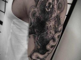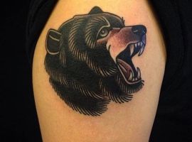 Грізлі. Цей звір вважається одним з найбільш лютих і небезпечних. Татуювання ведмідь на плечі часто позначає рішучість, сміливість, силу характеру свого володаря. В ескізі тварина найчастіше гарчить, на задніх лапах, наче в будь-яку секунду вона готова накинутися на свого супротивника.