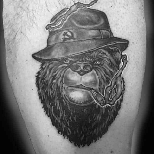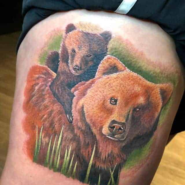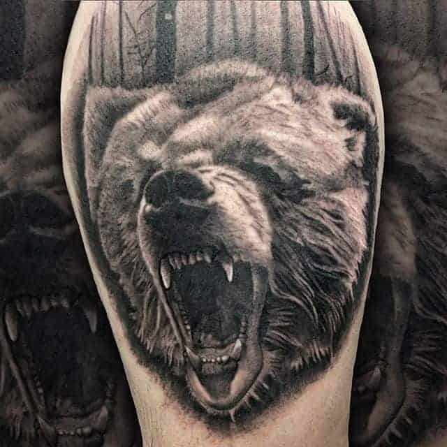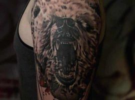 Грізлі. Цей звір вважається одним з найбільш лютих і небезпечних. Татуювання ведмідь на плечі часто позначає рішучість, сміливість, силу характеру свого володаря. В ескізі тварина найчастіше гарчить, на задніх лапах, наче в будь-яку секунду вона готова накинутися на свого супротивника.