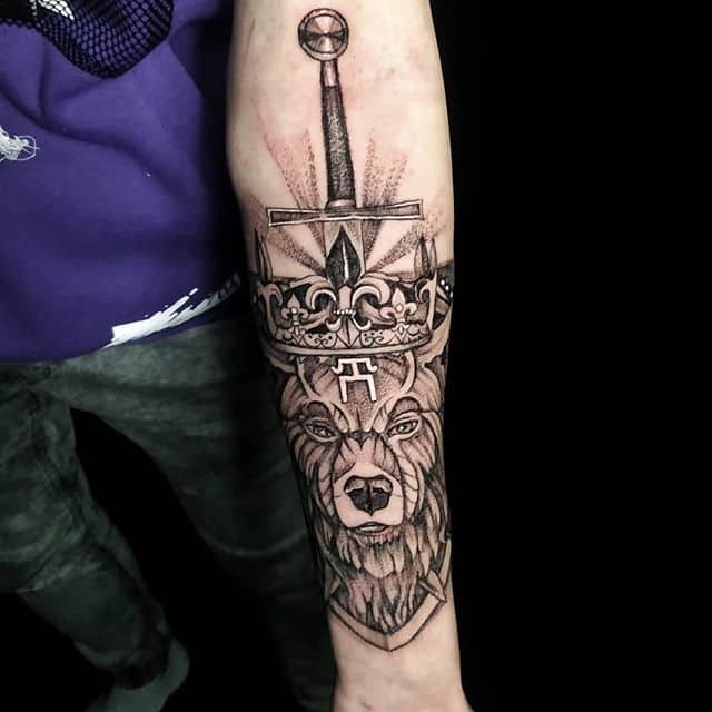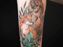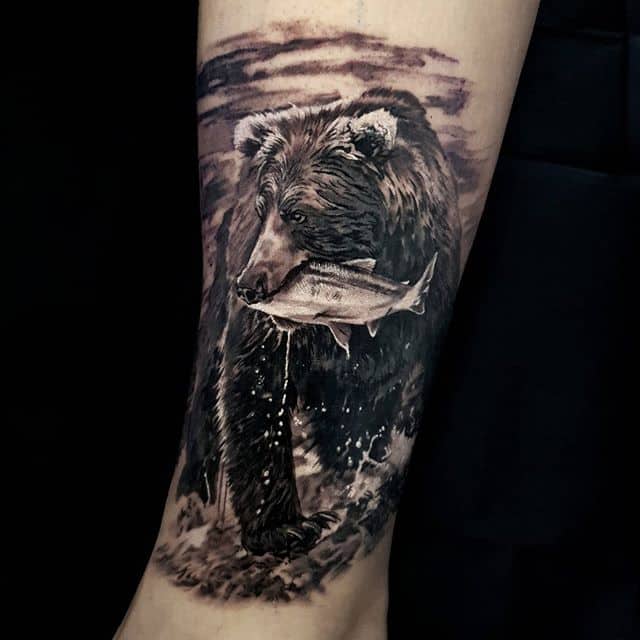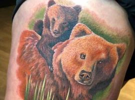 Бурий ведмідь. У більшості випадків, таке тату несе значення для чоловіків, як: сила, міць, сміливість духу, безстрашність. Таку ідею скоріше виберуть собі сильні характером люди – вони точно знають, чого хочуть від життя.