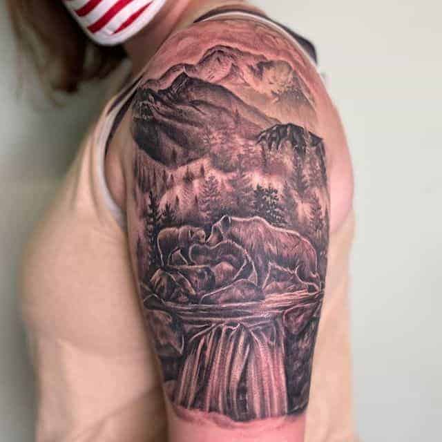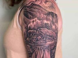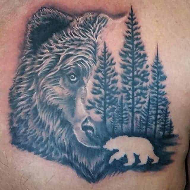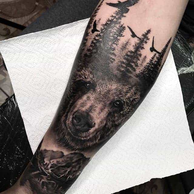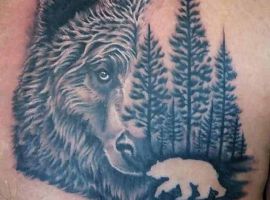 Ескіз, в якому звір знаходиться в своєму природному середовищі – ведмідь у лісі, горах, на природі – не несуть за собою особливо глибокого сенсу. Такі зображення можуть набивати просто для краси та естетики тіла. Найбільш ефектно виглядатиме кольоровий малюнок в стилі реалізм.