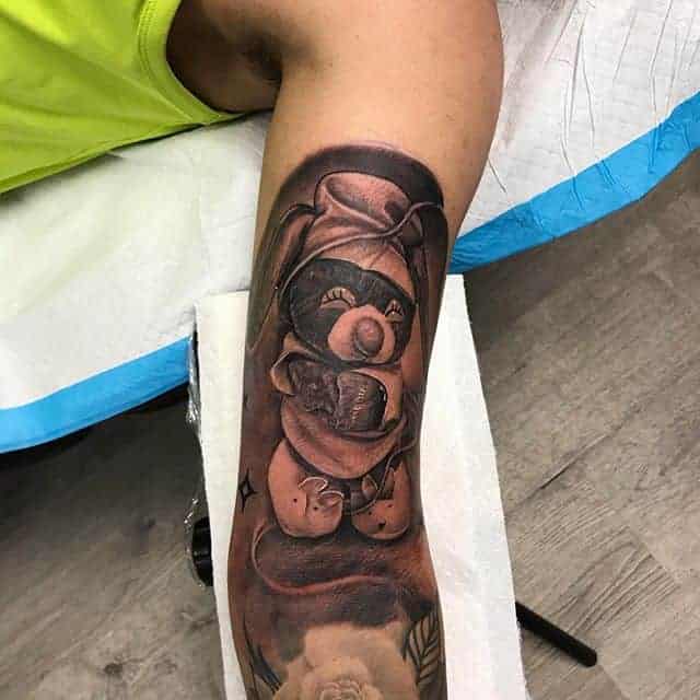 Плюшевий ведмедик. Це скоріше жіночий варіант ескізу. Символізує ніжність, романтичність натури, доброту. Але зустрічаються і варіанти з більш негативним підтекстом – на чоловічому тілі можна зустріти плюшевого ведмедика з фільмів жаху.