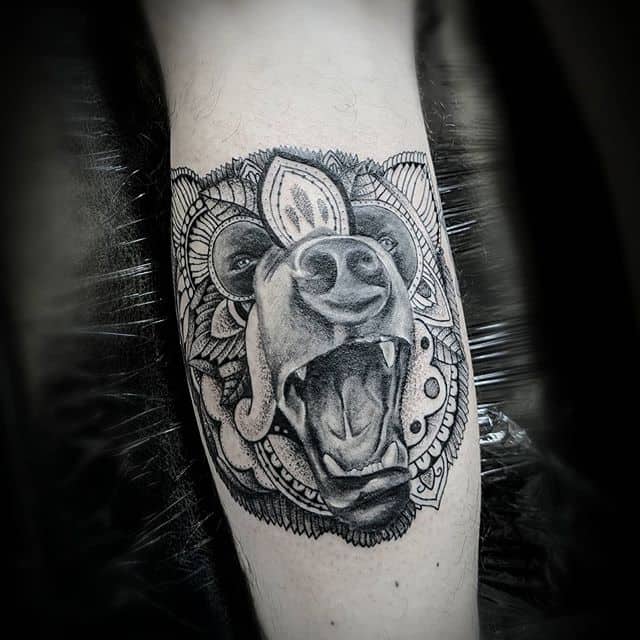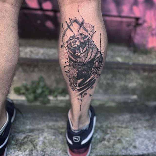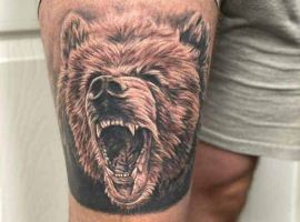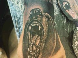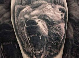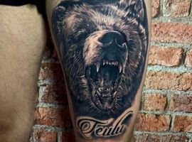 Ревучий звір (татуювання ведмедя з оскалом) означатиме агресію і прагнення захистити себе. Швидше за все, володар малюнка хотів показати, що він веде запеклу боротьбу з кимось або чимось у своєму житті.