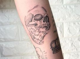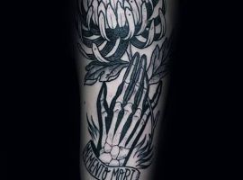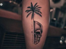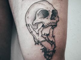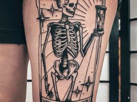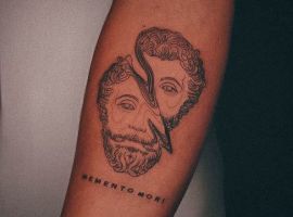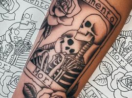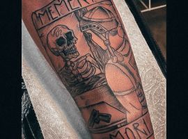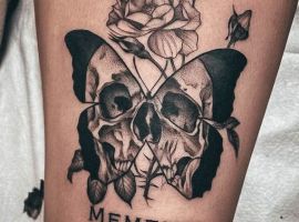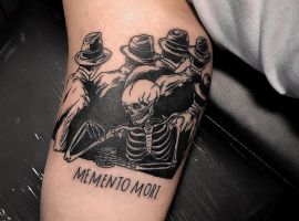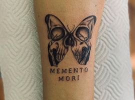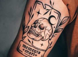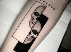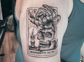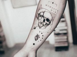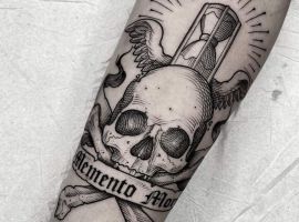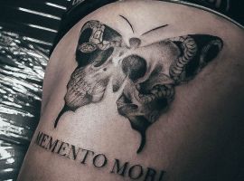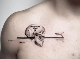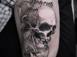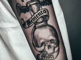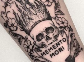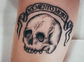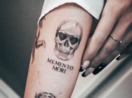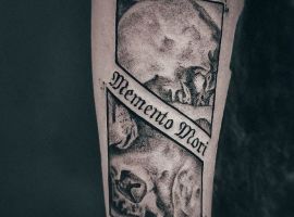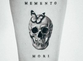 - Череп. «Пам’ятай про смерть» – значення фрази якнайкраще поєднується з образами, що символізують смерть. Найбільше асоціюються з нею образи черепа та скелета. Враховуючи сучасну техніку нанесення татуювань, сьогодні можна зобразити череп дуже красиво. Наприклад, в об’ємному стилі реалізм. Він дуже гармонійно поєднуватиметься з фразою Memento Mori.