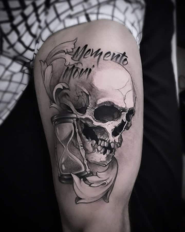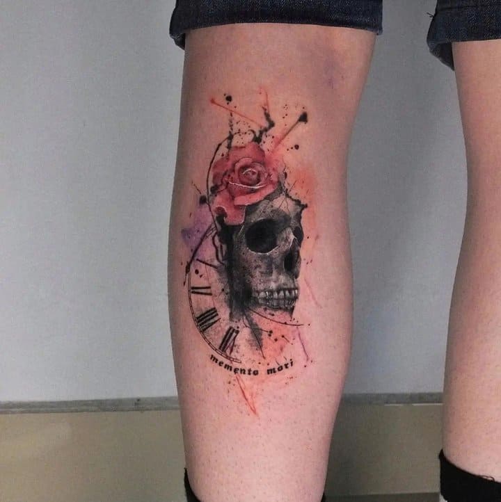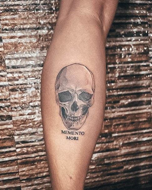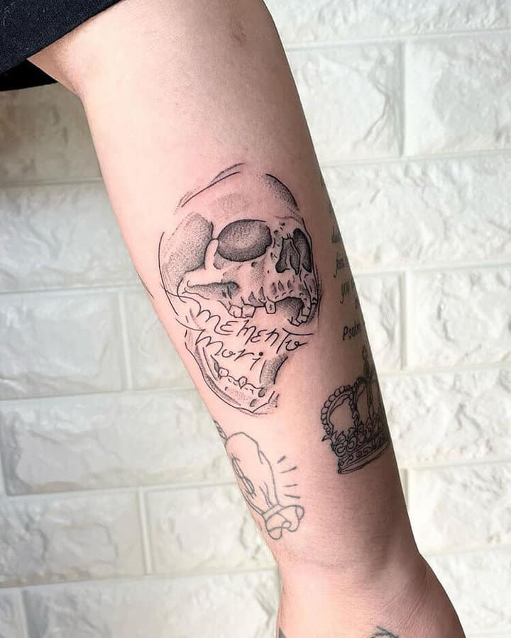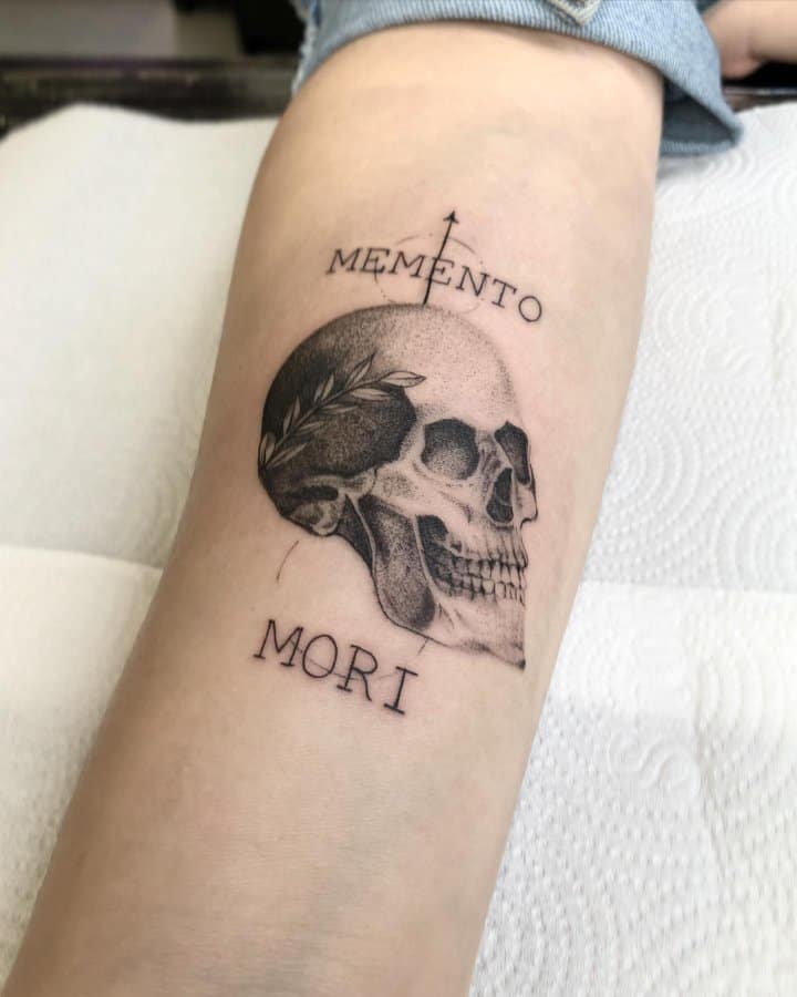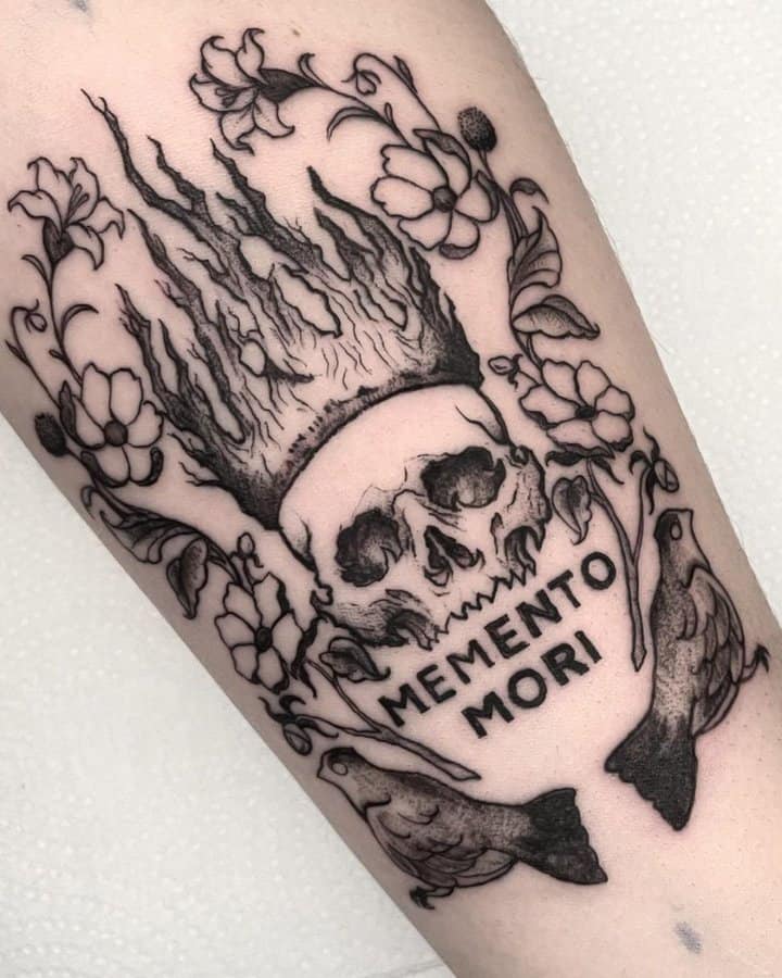 - Череп. «Пам’ятай про смерть» – значення фрази якнайкраще поєднується з образами, що символізують смерть. Найбільше асоціюються з нею образи черепа та скелета. Враховуючи сучасну техніку нанесення татуювань, сьогодні можна зобразити череп дуже красиво. Наприклад, в об’ємному стилі реалізм. Він дуже гармонійно поєднуватиметься з фразою Memento Mori.