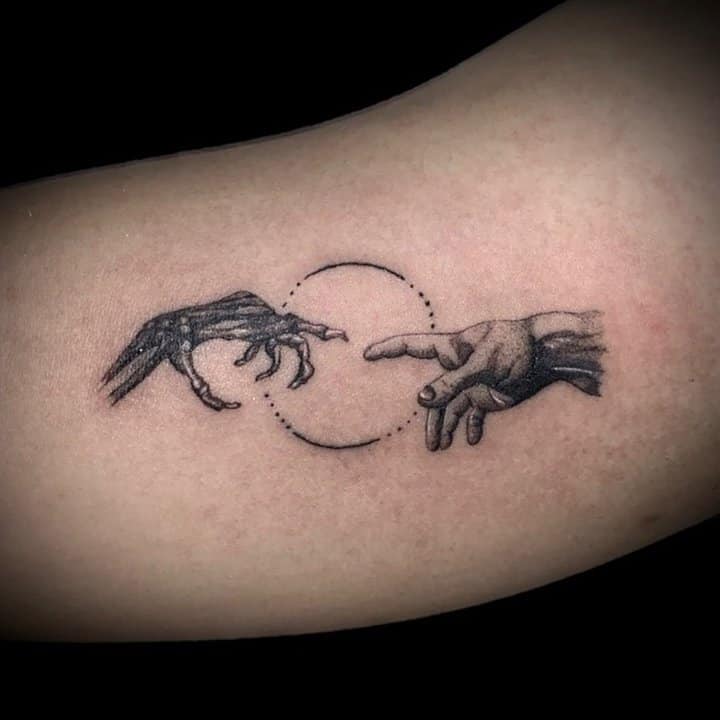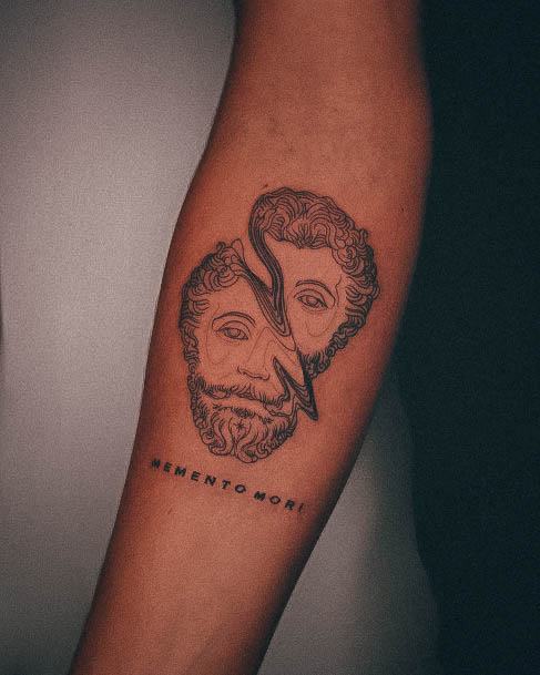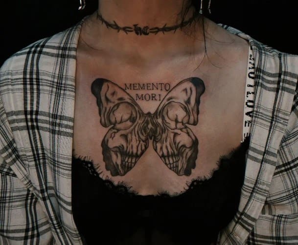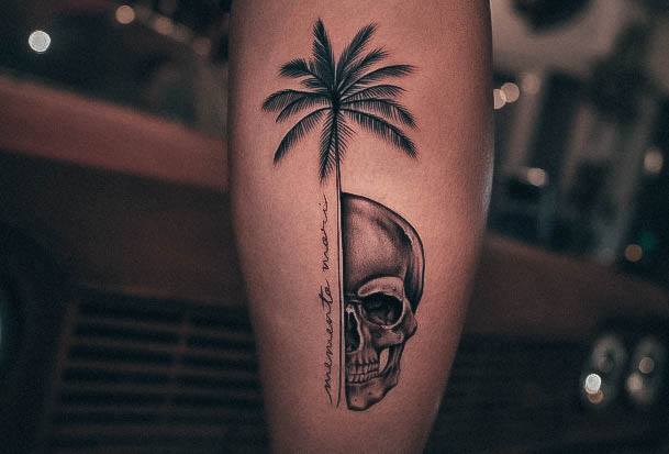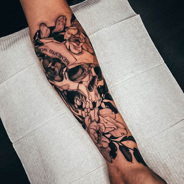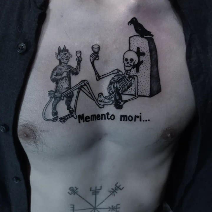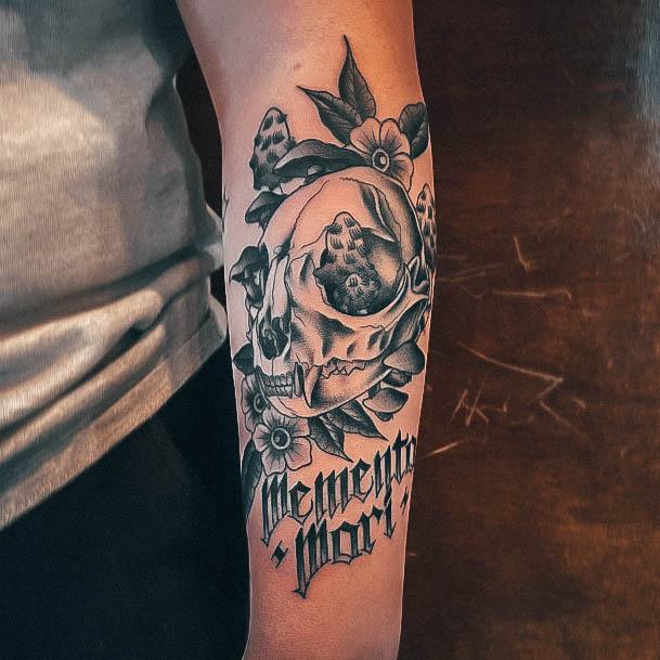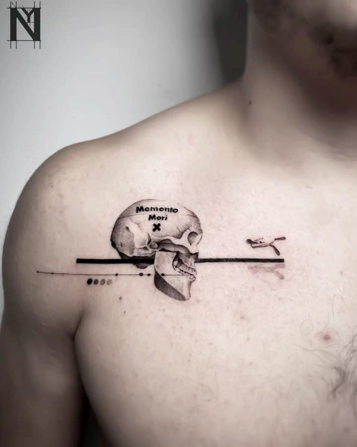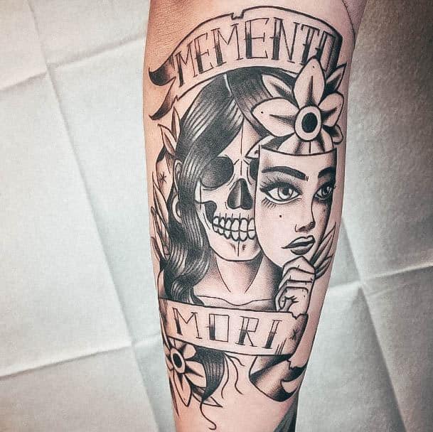 - Череп. «Пам’ятай про смерть» – значення фрази якнайкраще поєднується з образами, що символізують смерть. Найбільше асоціюються з нею образи черепа та скелета. Враховуючи сучасну техніку нанесення татуювань, сьогодні можна зобразити череп дуже красиво. Наприклад, в об’ємному стилі реалізм. Він дуже гармонійно поєднуватиметься з фразою Memento Mori.