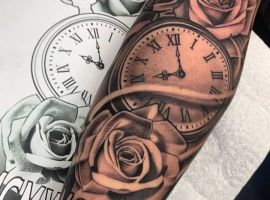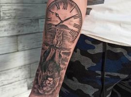 Подібного плану тату на руці виглядають дуже ефектно. Циферблат символізує безперервний плин часу. Розбитий годинник асоціюються з якимось втраченим часовим інтервалом. Чоловічі татуювання із зображенням годинника разом з трояндами служать нагадуванням про недовговічність молодості і життєвої енергії, адже квітковий бутон красивий і свіжий протягом невеликого періоду. Годинники з птахами означають свободу від вікових рамок і обмежень. Зокрема, ворони символізують мудрість, великий досвід і довголіття. Видимий годинниковий механізм – це прагнення до безперервного руху. Найчастіше годинник стає стильною прикрасою руки або яскравою деталлю тату рукава.