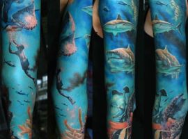 Досить популярні татуювання зі змістом на теми, пов’язані з професіями і захопленнями. Медицина, Авіація, космос, Дайвінг, подорожі, мореплавство, музика, Кухарська справа – будь-яке заняття і подія можуть знайти відображення в ескізах художника. Професійні теми дають величезний простір для фантазії.