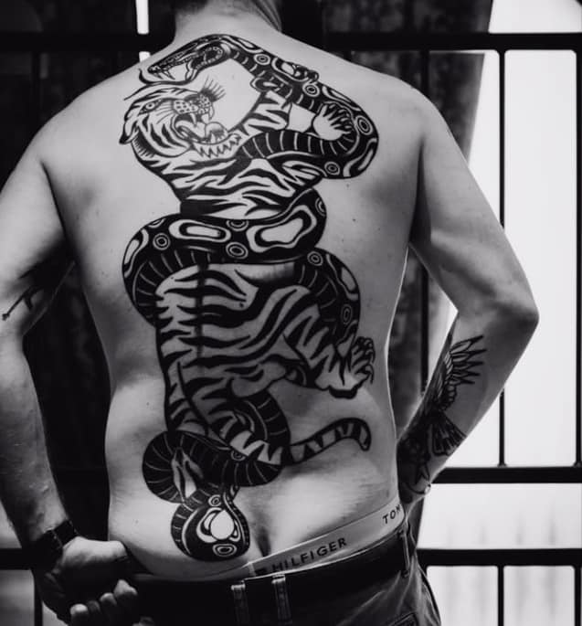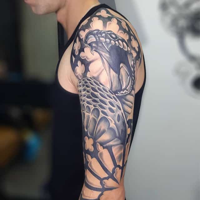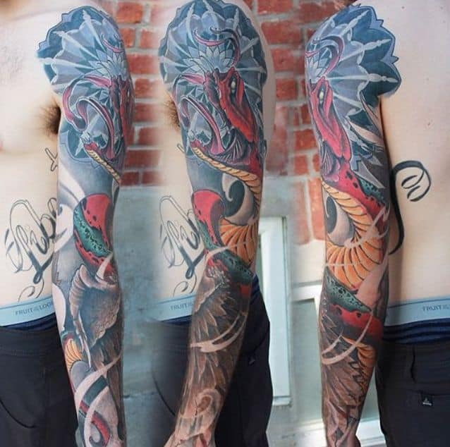 Плазуни асоціюються з холодністю і строгістю. Кобра і гадюка для чоловіка позначають таємничу і небезпечну сутність. При цьому зміїна шкіра приховує вразливу натуру, тому скинута зовнішня оболонка видає ранимий характер. Цікавим змістом наповнюються татуювання з відтворенням змія-спокусника. Чоловік, який вибрав подібний малюнок, демонструє пізнання зла і добра, усвідомлення людської гріховності. Зображення змій прекрасно підходять як для об’ємних композицій, так і для маленьких тату.