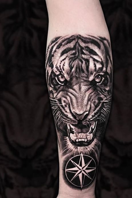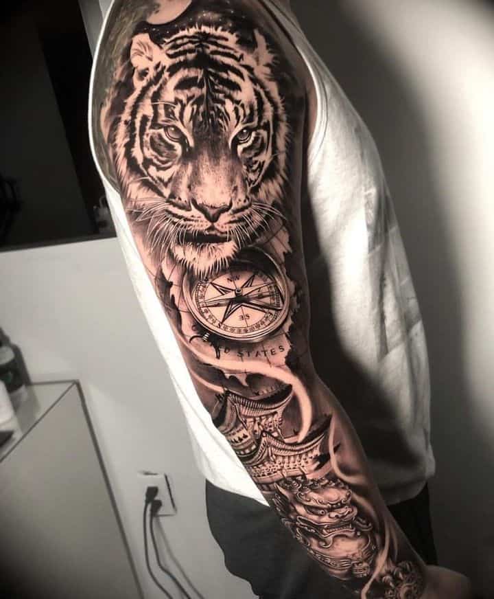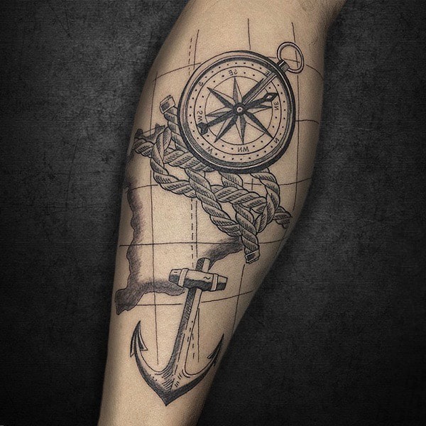 Навігаційний прилад символізує для чоловіка чіткість життєвих позицій, прагнення не сходити з наміченого шляху, рух до поставленої мети. Компас, зображений поверх географічної карти, демонструє пристрасть до подорожей. Прилад поруч з якорем означає, що пошуки пригод закінчуються яскравим фіналом. Компас чудово виглядає як на торсі, так і на кінцівках. Підходить для міні татуювань і складних сюжетів.