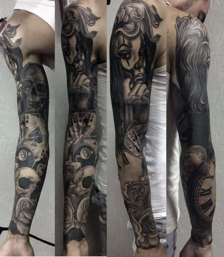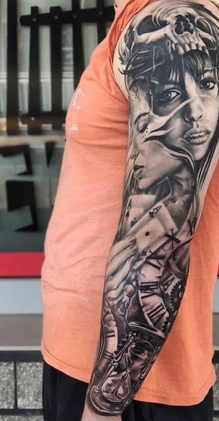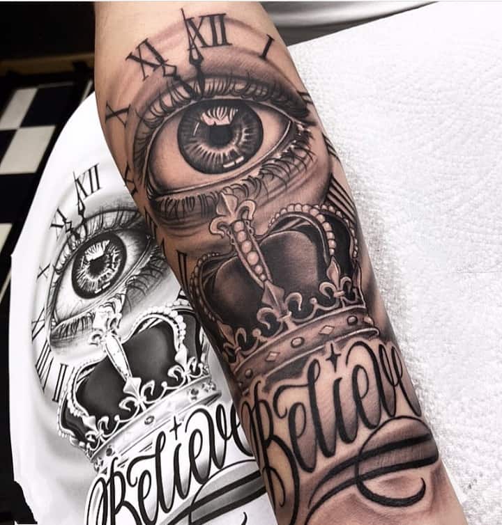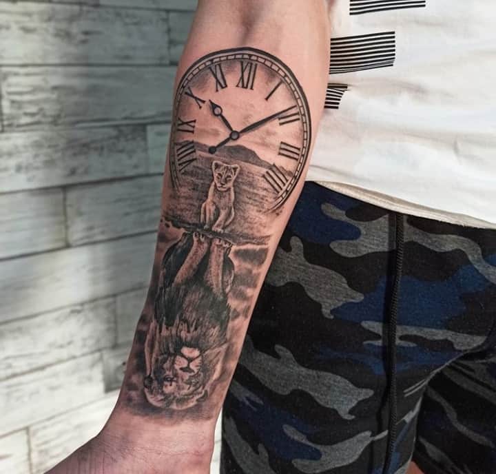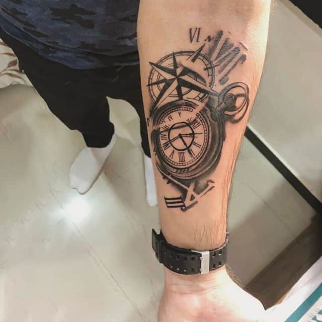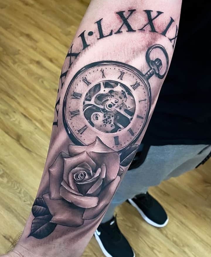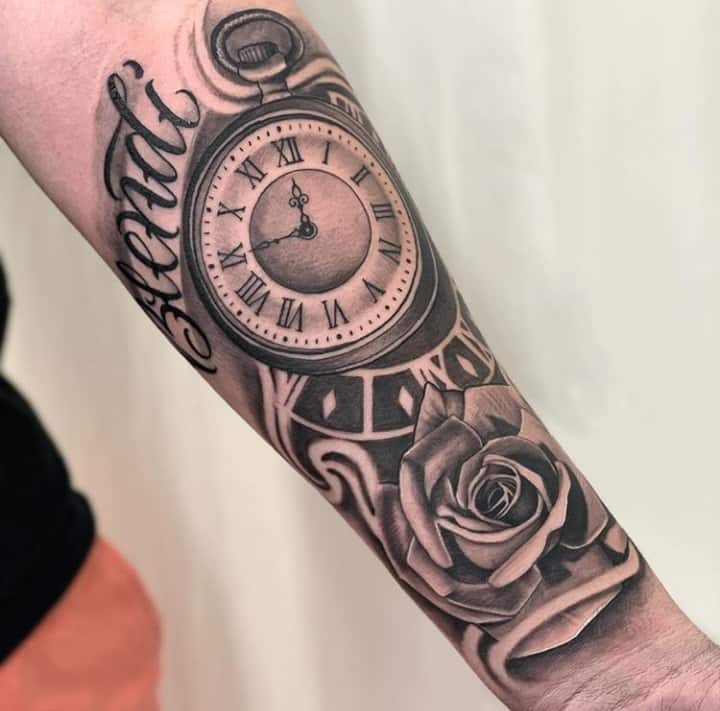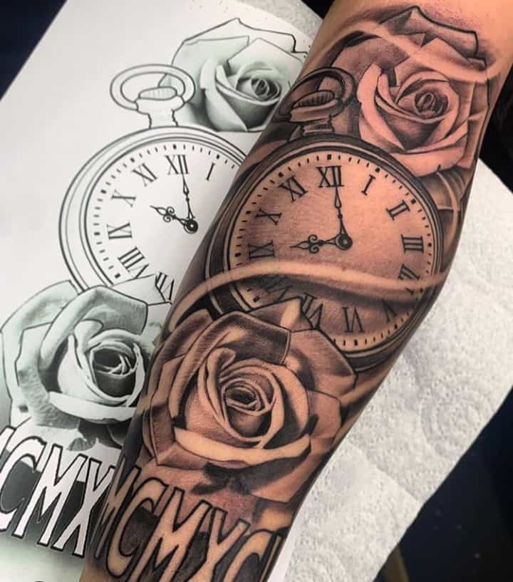 Подібного плану тату на руці виглядають дуже ефектно. Циферблат символізує безперервний плин часу. Розбитий годинник асоціюються з якимось втраченим часовим інтервалом. Чоловічі татуювання із зображенням годинника разом з трояндами служать нагадуванням про недовговічність молодості і життєвої енергії, адже квітковий бутон красивий і свіжий протягом невеликого періоду. Годинники з птахами означають свободу від вікових рамок і обмежень. Зокрема, ворони символізують мудрість, великий досвід і довголіття. Видимий годинниковий механізм – це прагнення до безперервного руху. Найчастіше годинник стає стильною прикрасою руки або яскравою деталлю тату рукава.